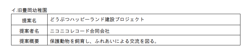 - やす子さんは民間提案制度のプレゼン審査を経て「どうぶつハッピーランド建設プロジェクト」が採用。旧豊岡幼稚園の利活用に向けた詳細協議が進んでいる