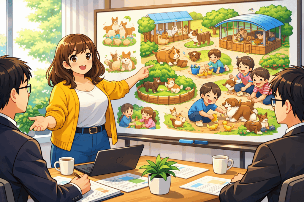 そして、プレゼンテーション形式の提案審査が行われ、その結果として「どうぶつハッピーランド建設プロジェクト」は採用の判断が下されました。